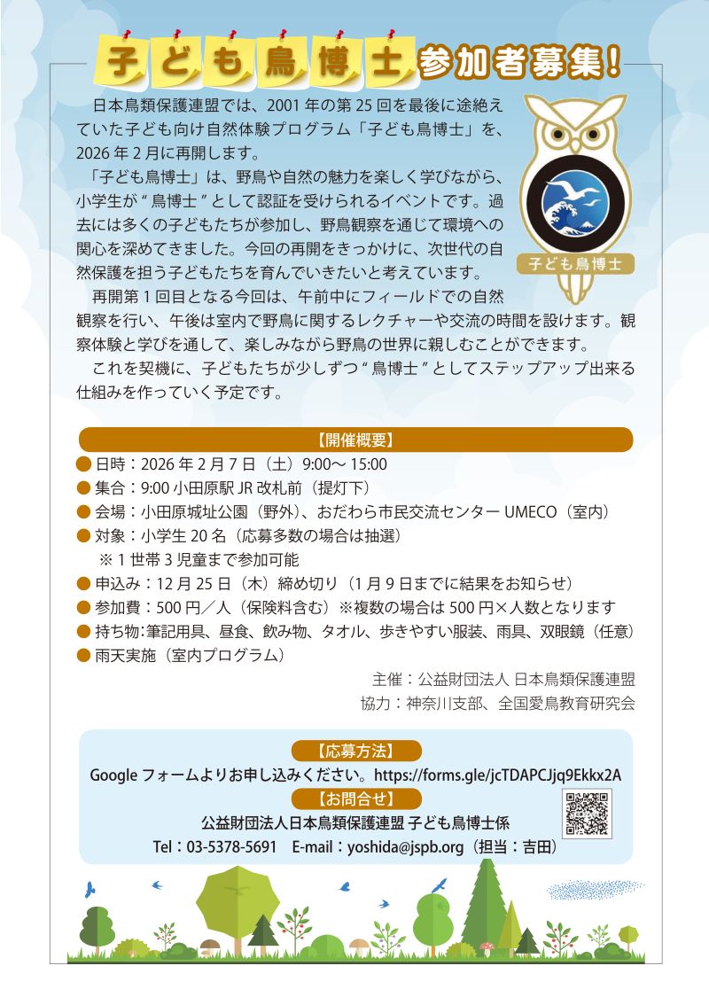 「子ども鳥博士」は、野鳥や自然の魅力を楽しく学びながら、小学生が“鳥博士”として認証を受けられるイベントです。過去には多くの子どもたちが参加し、野鳥観察を通じて環境への関心を深めてきました。今回の再開をきっかけに、次世代の自然保護を担う子どもたちを育んでいきたいと考えています。